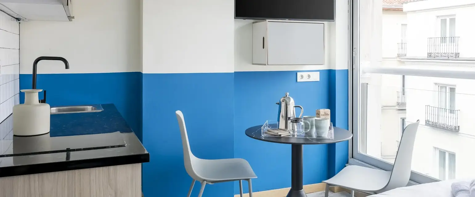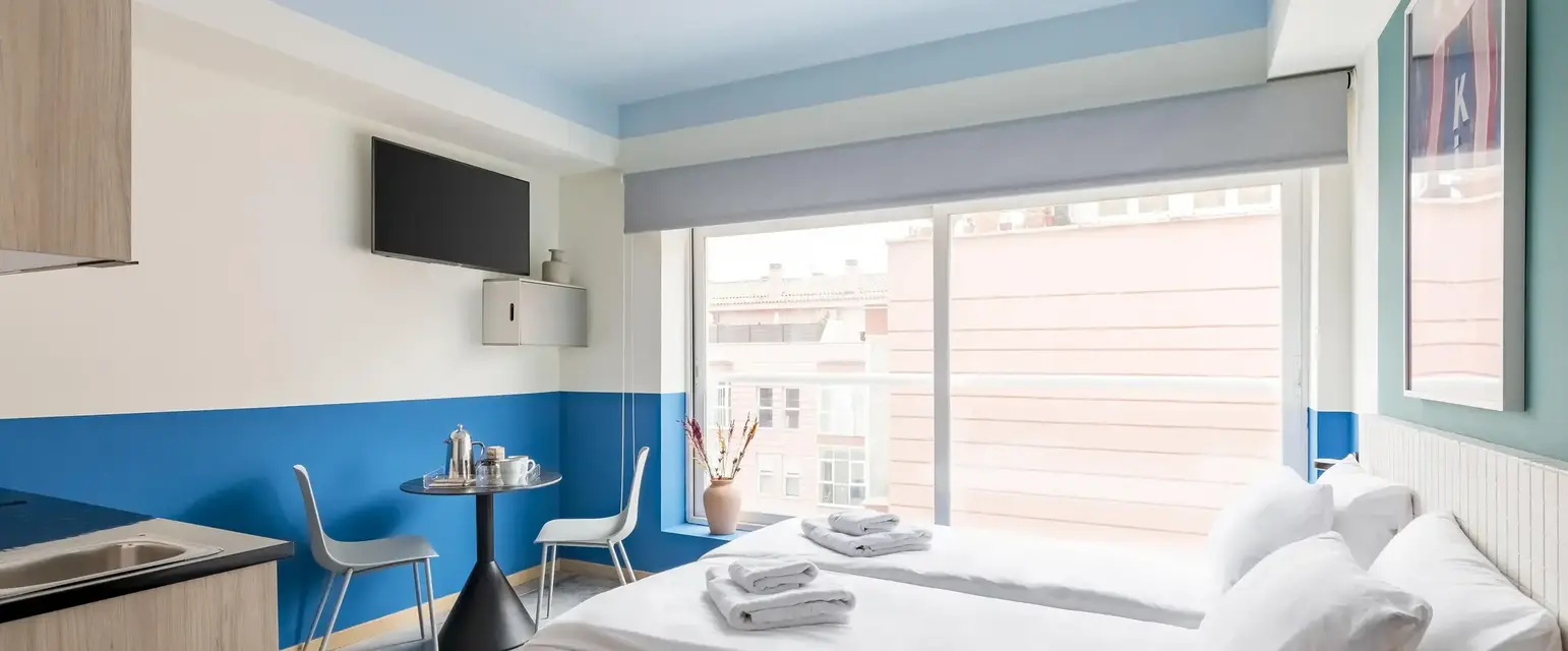 This apartment features either a queen or double-size bed. The 4th-floor windows offer city awesome city views of Fuencarral street or the neighbouring plaza. Because Fuencarral is a bustling shopping and pedestrian street, you may hear the sounds of the city from outside, particularly on the weekends. If you’re a light sleeper, Bob recommends using earplugs or booking one of our “quiet” apartments facing away from the street in the same building. Pets are not allowed at this property.