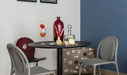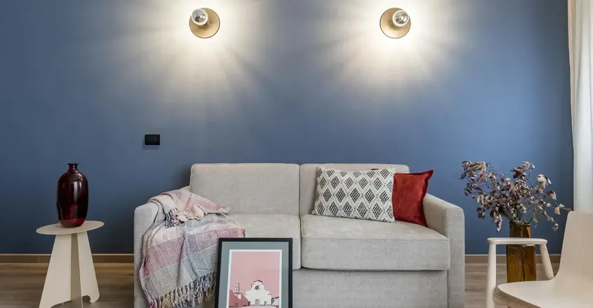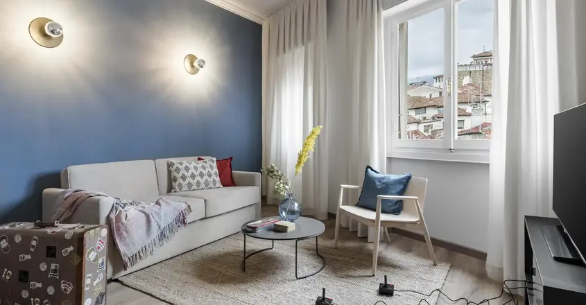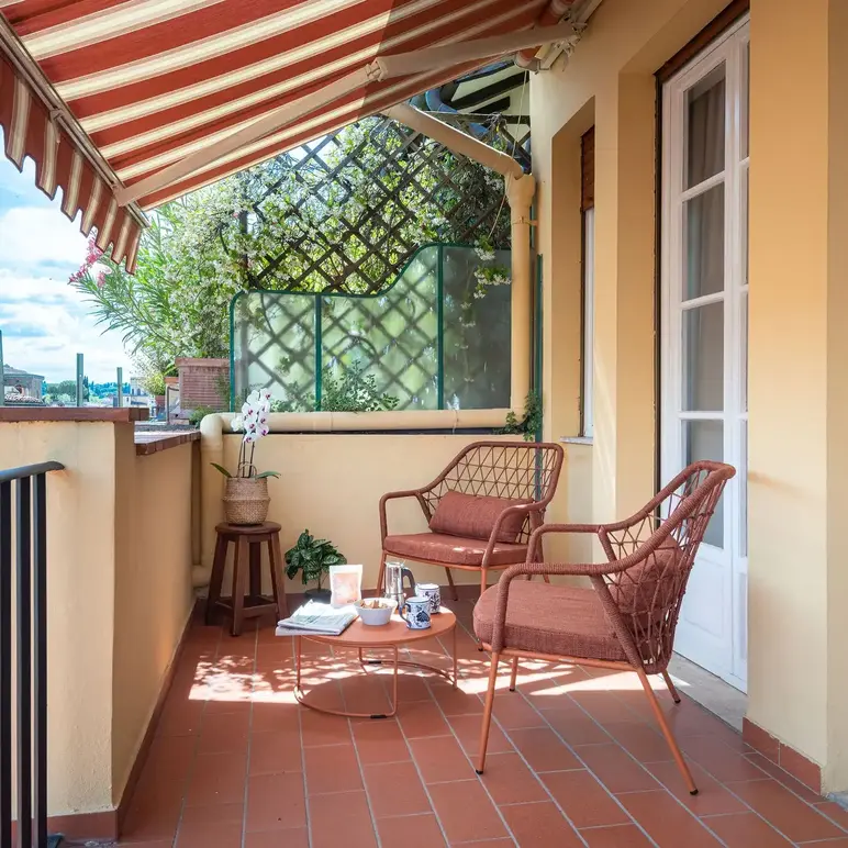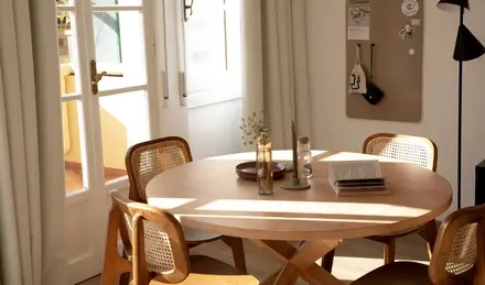 Inside, the apartment mirrors the neighbourhood’s artistic soul. Gold accents catch the light from tall windows, while colourful tiles and hand-painted ceramics give each corner character. Natural textiles soften the space, inviting you to linger on sofas or rugs warmed by the afternoon sun.