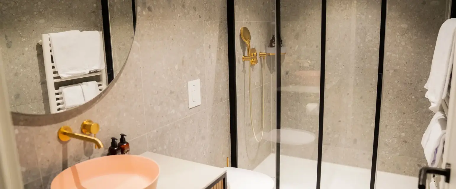 Functional furniture and a heavy lean into natural light keep things low-key. Apart from the bathroom, that is. Gold fixtures, luxury bodycare, and a waterfall shower make it a spa-like experience.