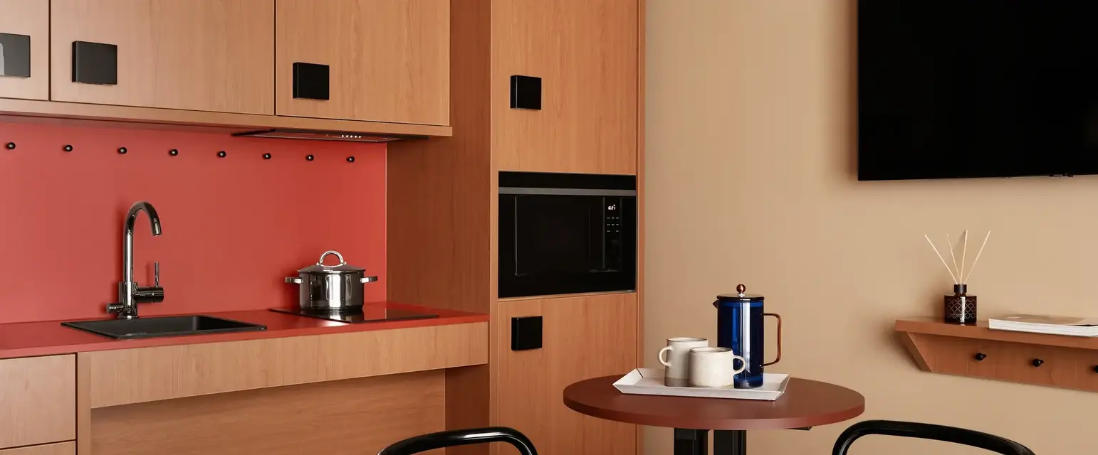 Feel right at home with a full kitchen. You’ll find everything you need to fine dine, right in your own studio. Bob’s kitchens are equipped with a fridge, combi-oven, microwave, fridge, sink & dishwasher. All the trimmings included, no need to pack your own frying pan.